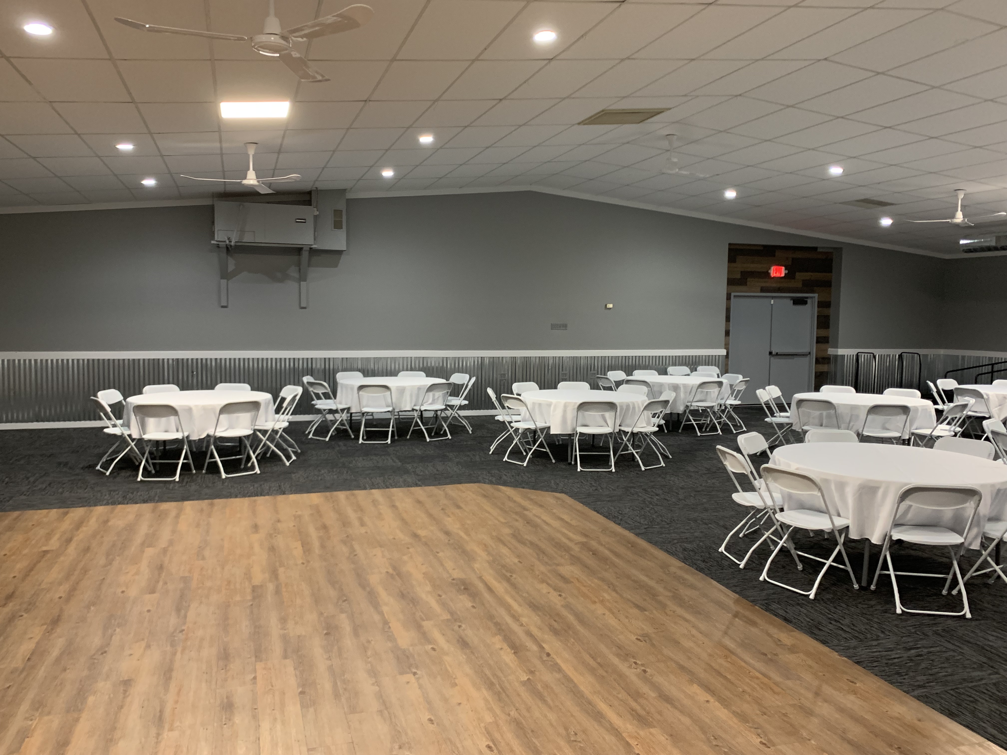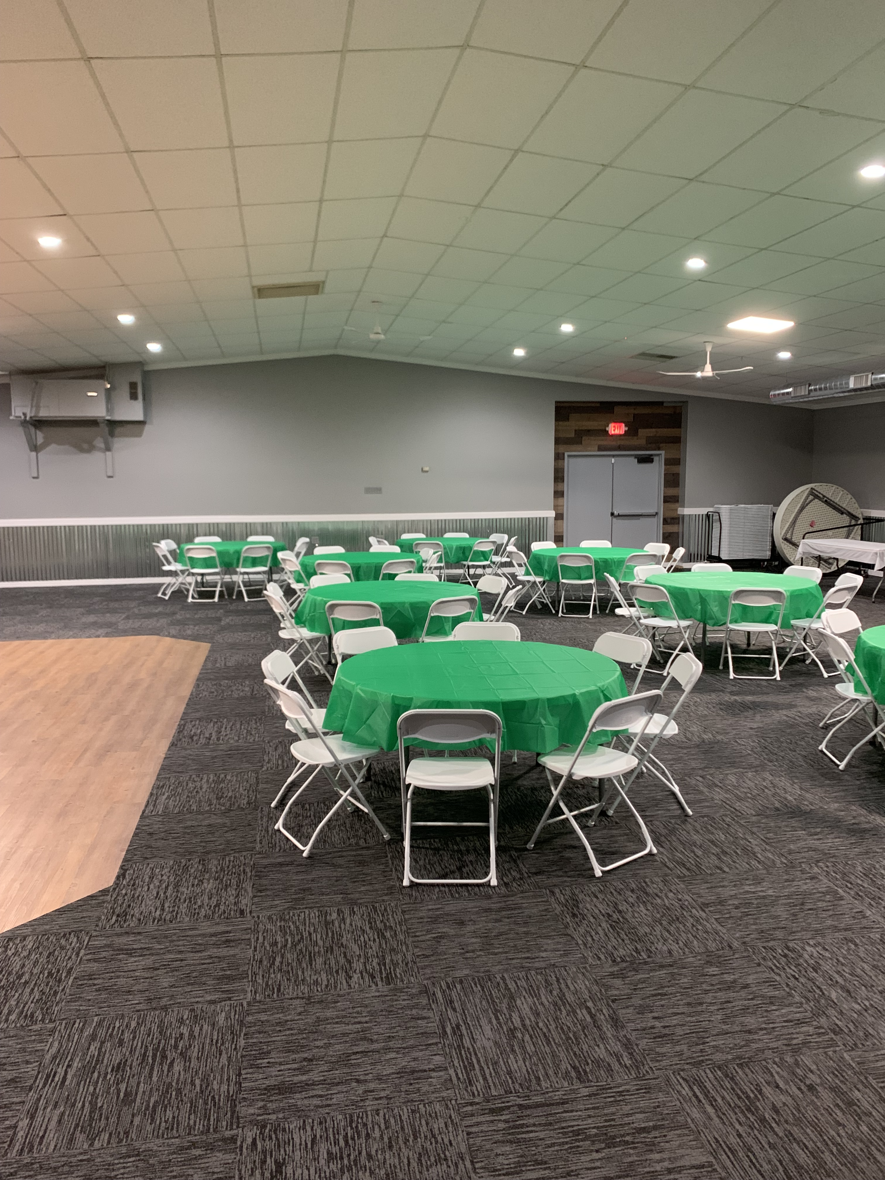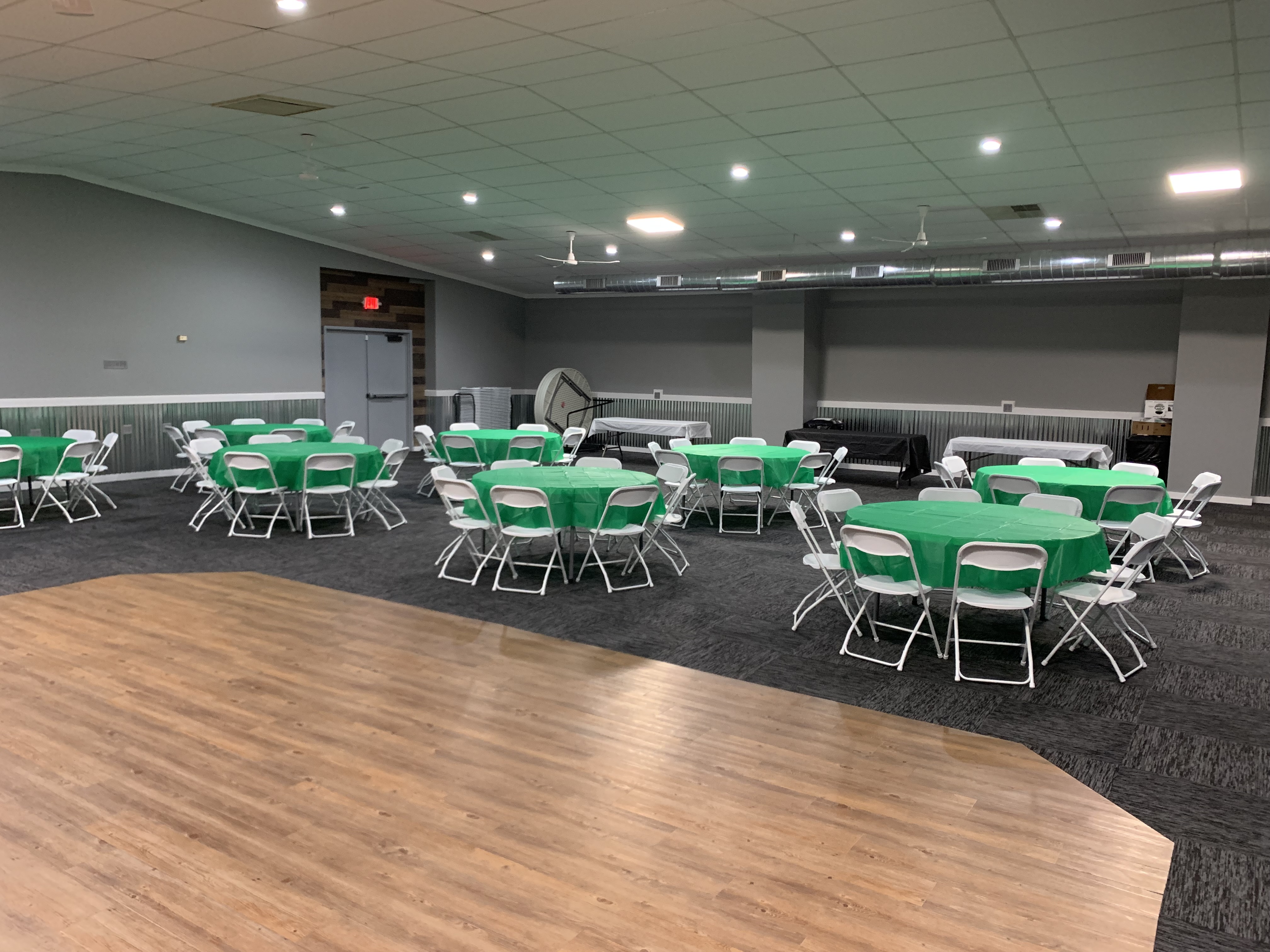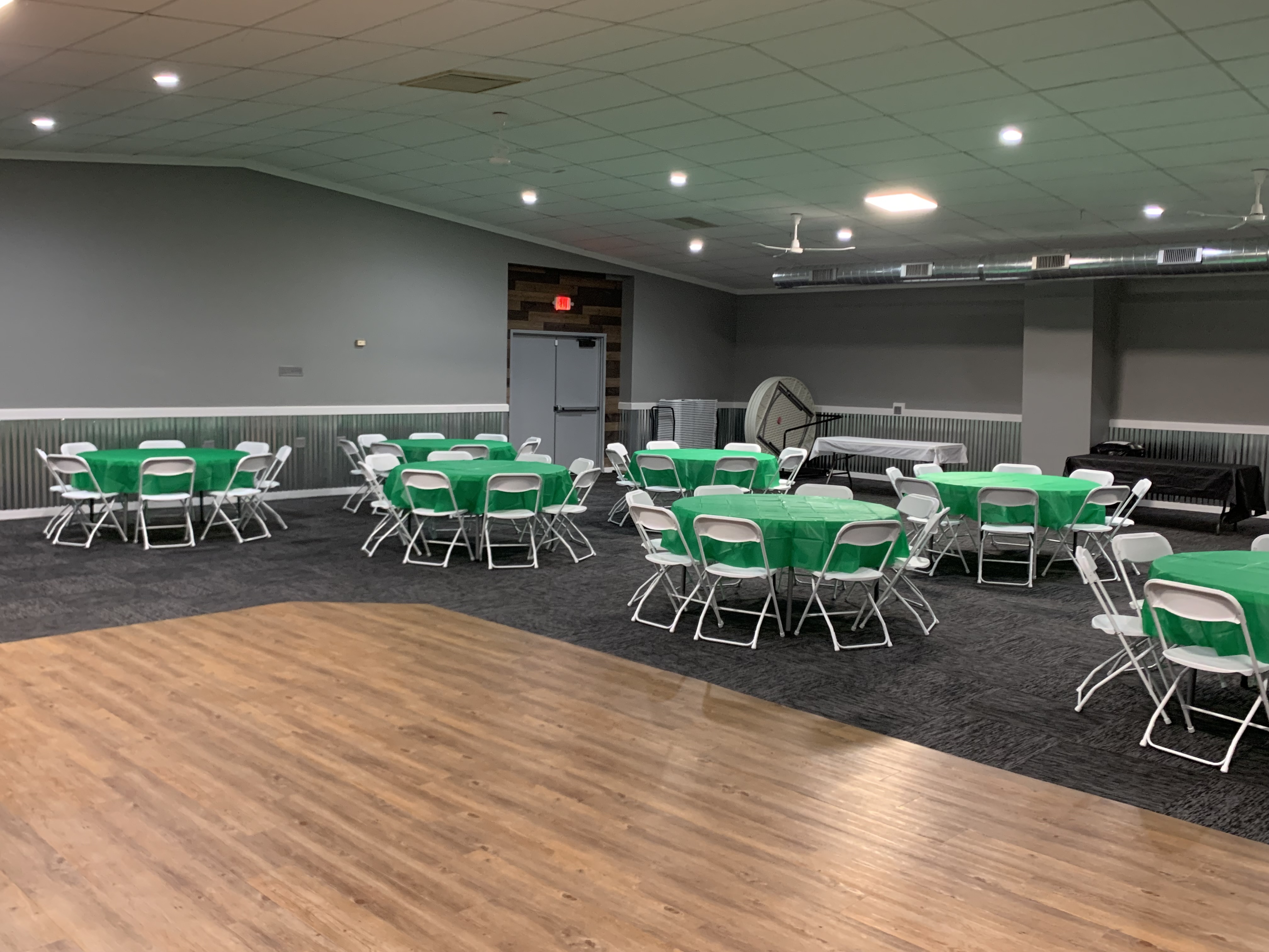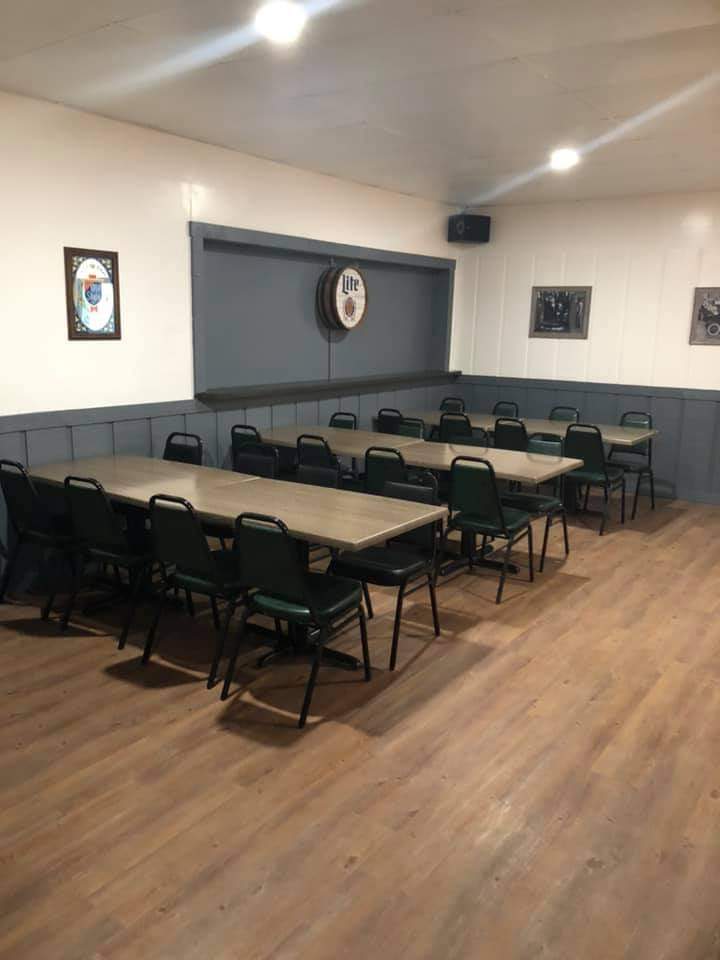 Our venue is spacious with its own bar and we have new tables and seating for 100 people. It is perfect for meetings, celebrations, birthdays and weddings. We are booking events now!